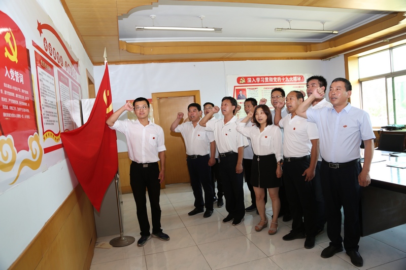 “我志愿加入中國共產黨……為共產主義奮斗終身,隨時準備為黨和人民犧牲一切,永不叛黨。”佩戴黨徽的黨員代表在鮮紅的黨旗下重溫入黨誓詞,他們高舉右手、握緊拳頭,莊嚴宣誓,這是一個黨員向組織一生的承諾,也是一個黨員向組織一生的擔當——不忘初心,牢記使命!