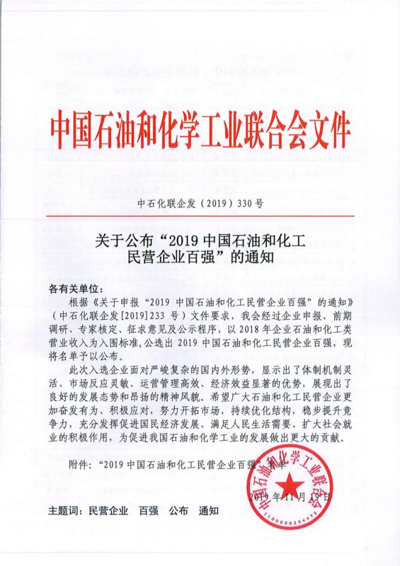 中國石油和化學工業聯合會近日發布了2019年中國石油和化工民營企業百強名單,我集團入圍,名列第66位。