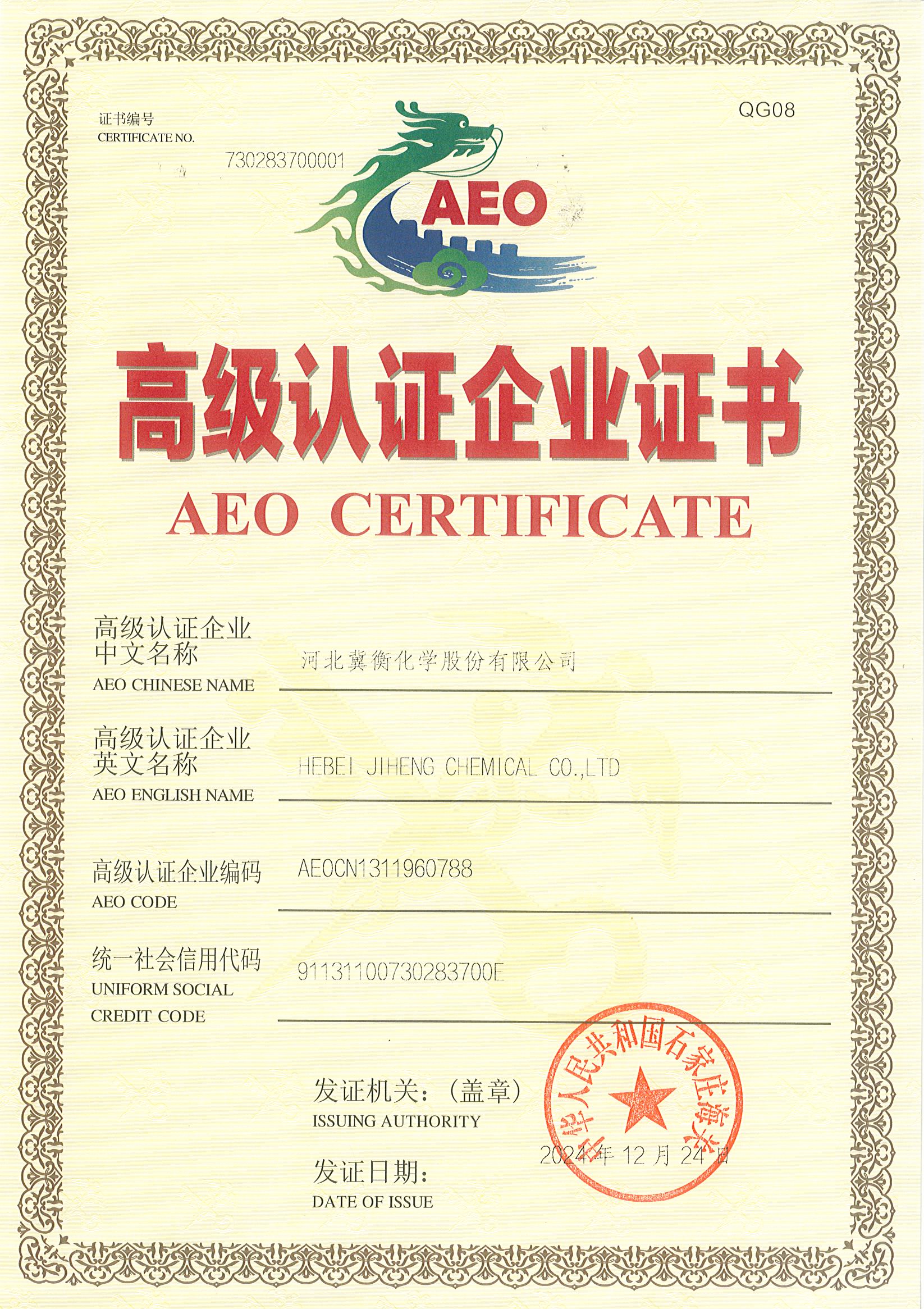 近日,河北冀衡化學(xué)股份有限公司取得了中華人民共和國(guó)石家莊海關(guān)頒發(fā)的《AEO高級(jí)認(rèn)證企業(yè)證書(shū)》,公司被認(rèn)證為AEO高級(jí)認(rèn)證企業(yè)。